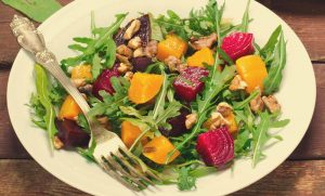 Salada de rúcula, abóbora e beterraba com nozes